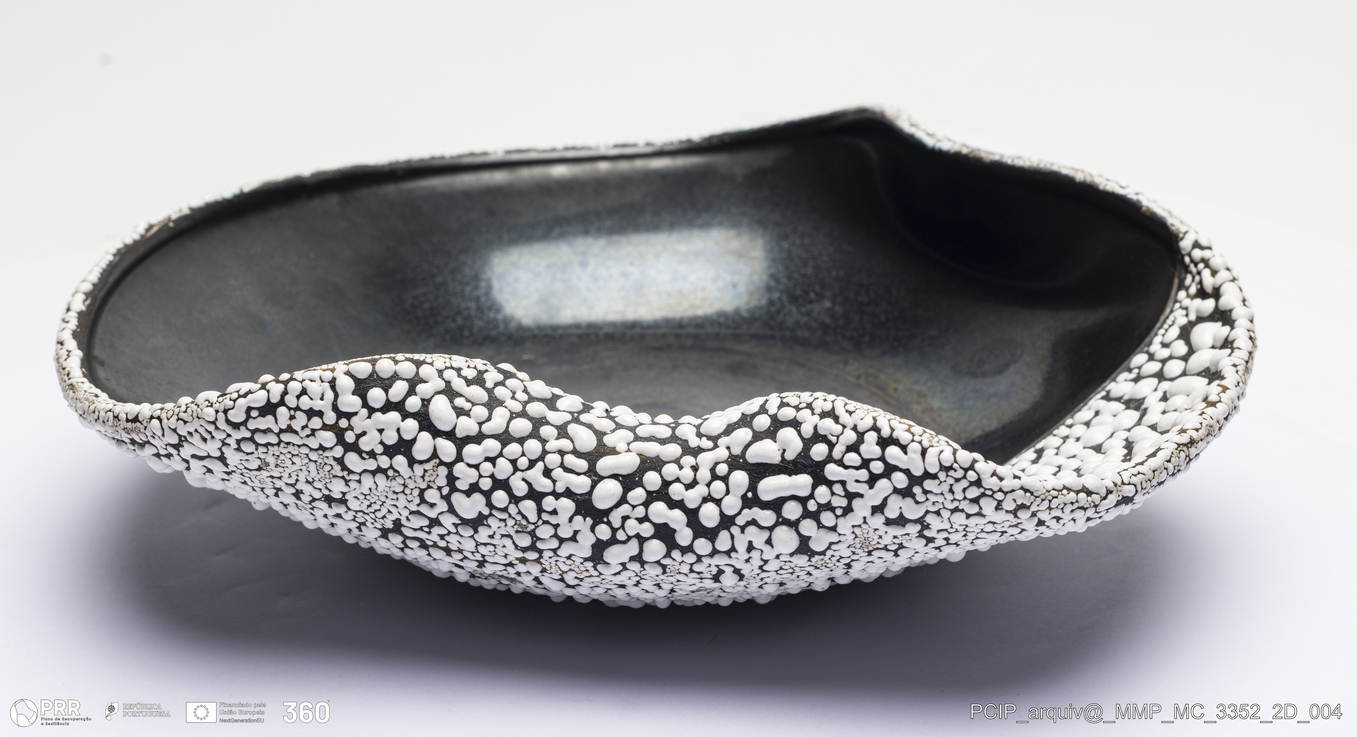 Matéria/Técnica: Barro vermelho rodado e moldado. Vidrado polícromo mate: preto e branco; Cronologia: Século XX; Autoria: Desconhecido /Áustria; Dimensões (cm): Altura: 7; Largura: 23,5; Comprimento: 235.
