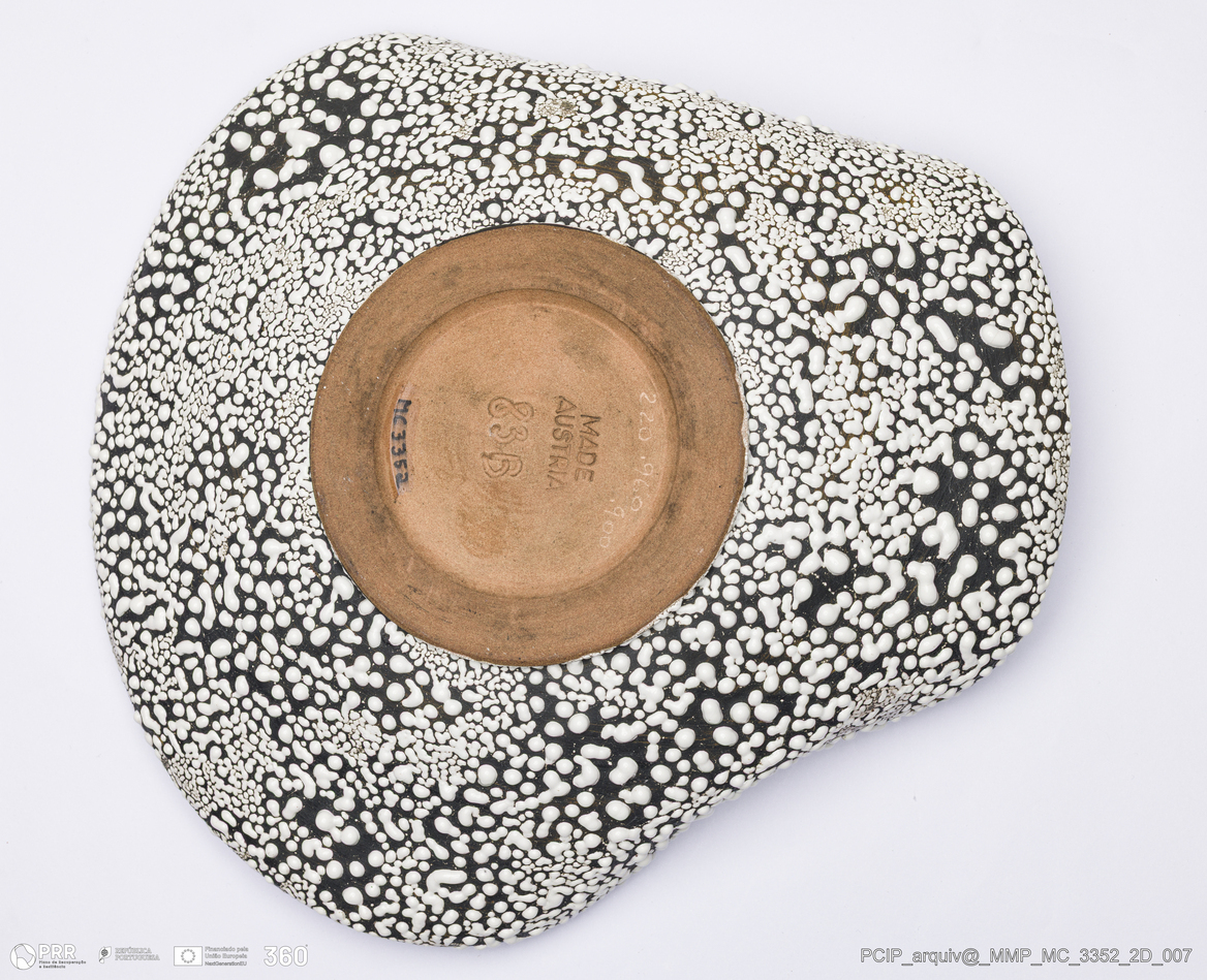 Matéria/Técnica: Barro vermelho rodado e moldado. Vidrado polícromo mate: preto e branco; Cronologia: Século XX; Autoria: Desconhecido /Áustria; Dimensões (cm): Altura: 7; Largura: 23,5; Comprimento: 235.