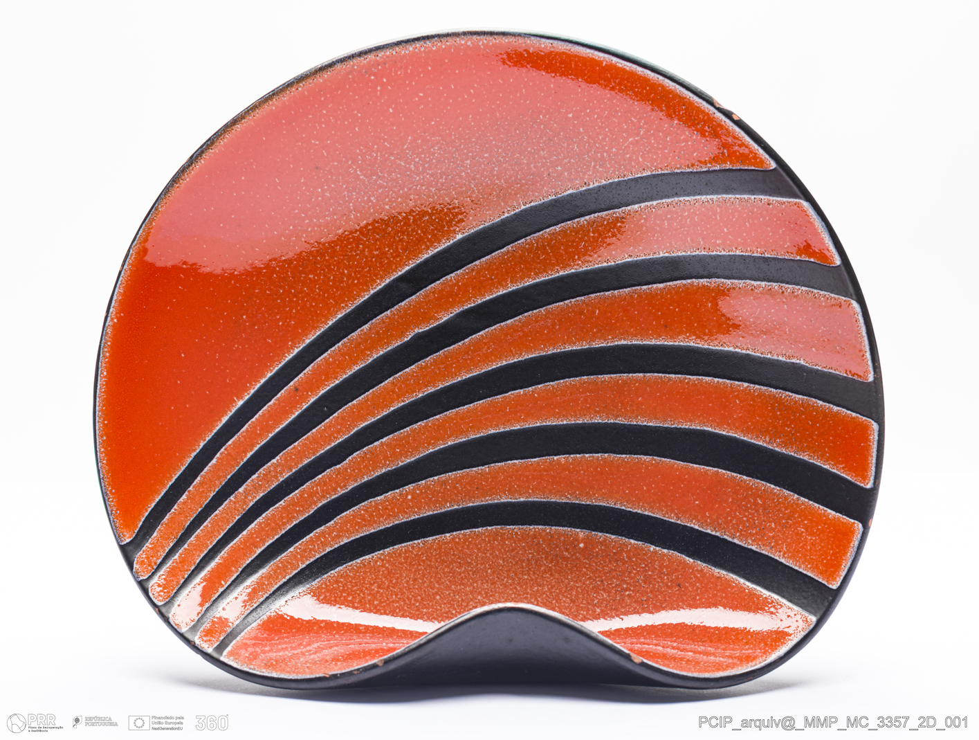 Matéria/Técnica: Barro vermelho rodado. Vidrado polícromo preto e laranja; Cronologia: Século XX; Autoria: Muller Cuzen / Suiça; Dimensões (cm): Altura: 6; Largura: 17,5; Comprimento: 21,4.