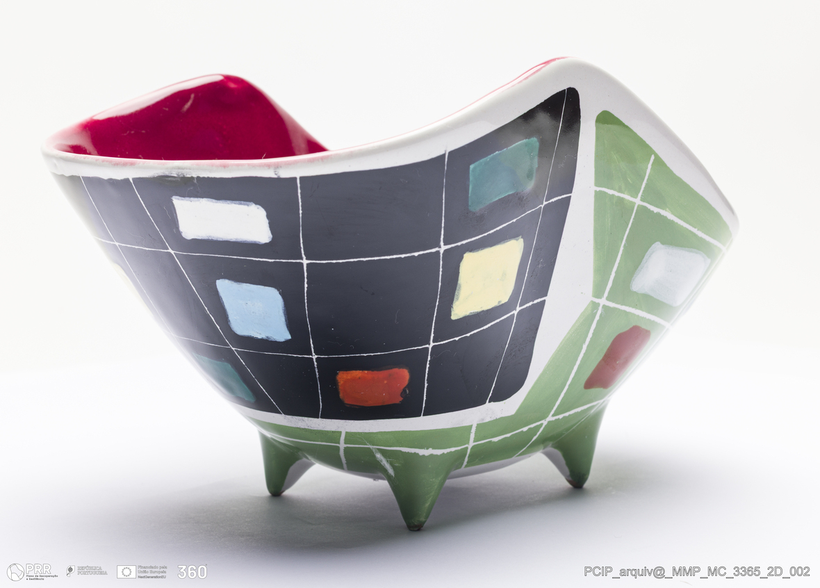 Matéria/Técnica: Faiança moldada e modelada. Vidrado polícromo: preto, azul, vermelho, verde, amarelo, castanho, laranja e branco; Cronologia: 1940; Autoria: Desconhecido / Itália; Dimensões (cm): Altura: 12,5; Largura: 15,7; Comprimento: 21.