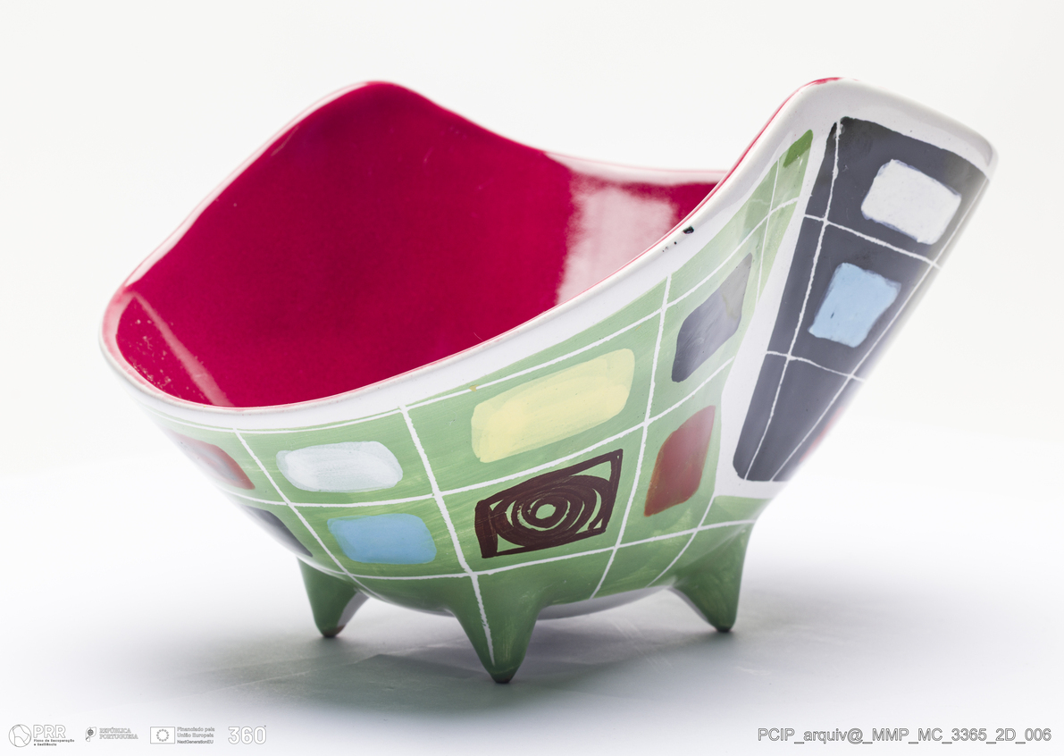 Matéria/Técnica: Faiança moldada e modelada. Vidrado polícromo: preto, azul, vermelho, verde, amarelo, castanho, laranja e branco; Cronologia: 1940; Autoria: Desconhecido / Itália; Dimensões (cm): Altura: 12,5; Largura: 15,7; Comprimento: 21.