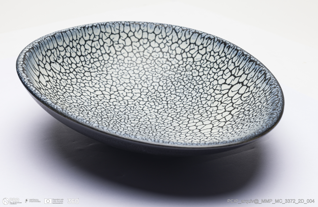 Matéria/Técnica: Barro branco moldado. Técnica de crawling. Vidrado polícromo: preto, azul escuro e claro; Cronologia: 1945-1984; Autoria: Desconhecido / Dumler & Breiden, Alemanha; Dimensões (cm): Altura: 6,7; Largura: 19; Comprimento: 23,4.