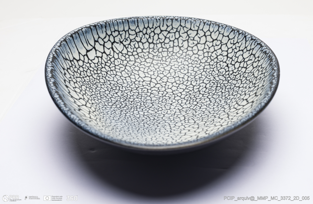 Matéria/Técnica: Barro branco moldado. Técnica de crawling. Vidrado polícromo: preto, azul escuro e claro; Cronologia: 1945-1984; Autoria: Desconhecido / Dumler & Breiden, Alemanha; Dimensões (cm): Altura: 6,7; Largura: 19; Comprimento: 23,4.