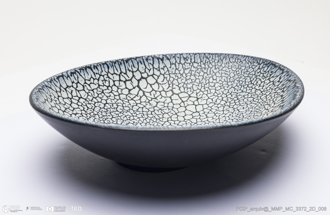Matéria/Técnica: Barro branco moldado. Técnica de crawling. Vidrado polícromo: preto, azul escuro e claro; Cronologia: 1945-1984; Autoria: Desconhecido / Dumler & Breiden, Alemanha; Dimensões (cm): Altura: 6,7; Largura: 19; Comprimento: 23,4.