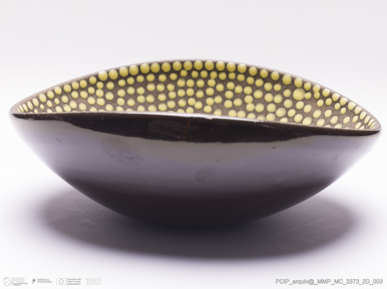 Matéria/Técnica: Grés moldado. Vidrado polícromo: castanho escuro e amarelo; Cronologia: Século XX; Autoria: Desconhecido / Aly, Suécia; Dimensões (cm): Altura: 8,5; Largura: 18; Comprimento: 23.