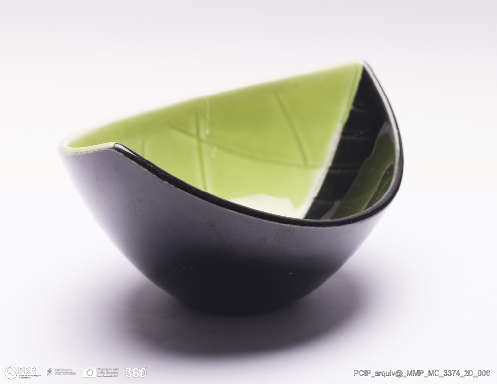 Matéria/Técnica: Porcelana moldada. Vidrado polícromo: preto e verde; Cronologia: 1950; Autoria: Desconhecido / Rorstrand, Suécia; Dimensões (cm): Altura: 7,8; Largura: 11; Comprimento: 14,5.