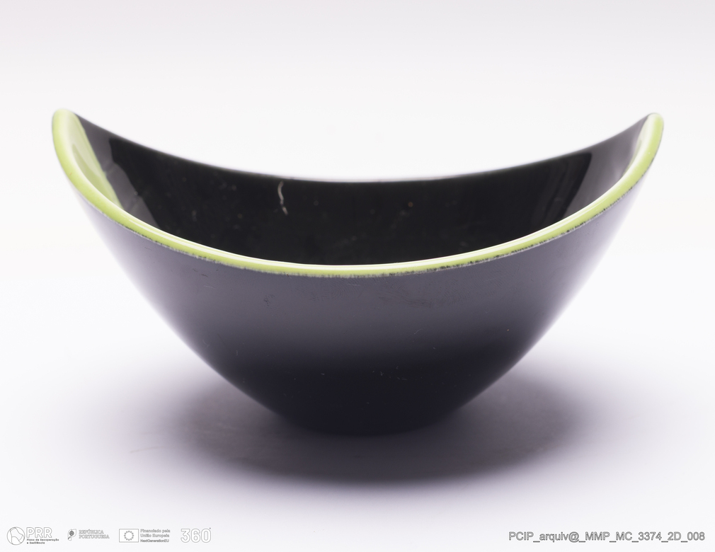 Matéria/Técnica: Porcelana moldada. Vidrado polícromo: preto e verde; Cronologia: 1950; Autoria: Desconhecido / Rorstrand, Suécia; Dimensões (cm): Altura: 7,8; Largura: 11; Comprimento: 14,5.