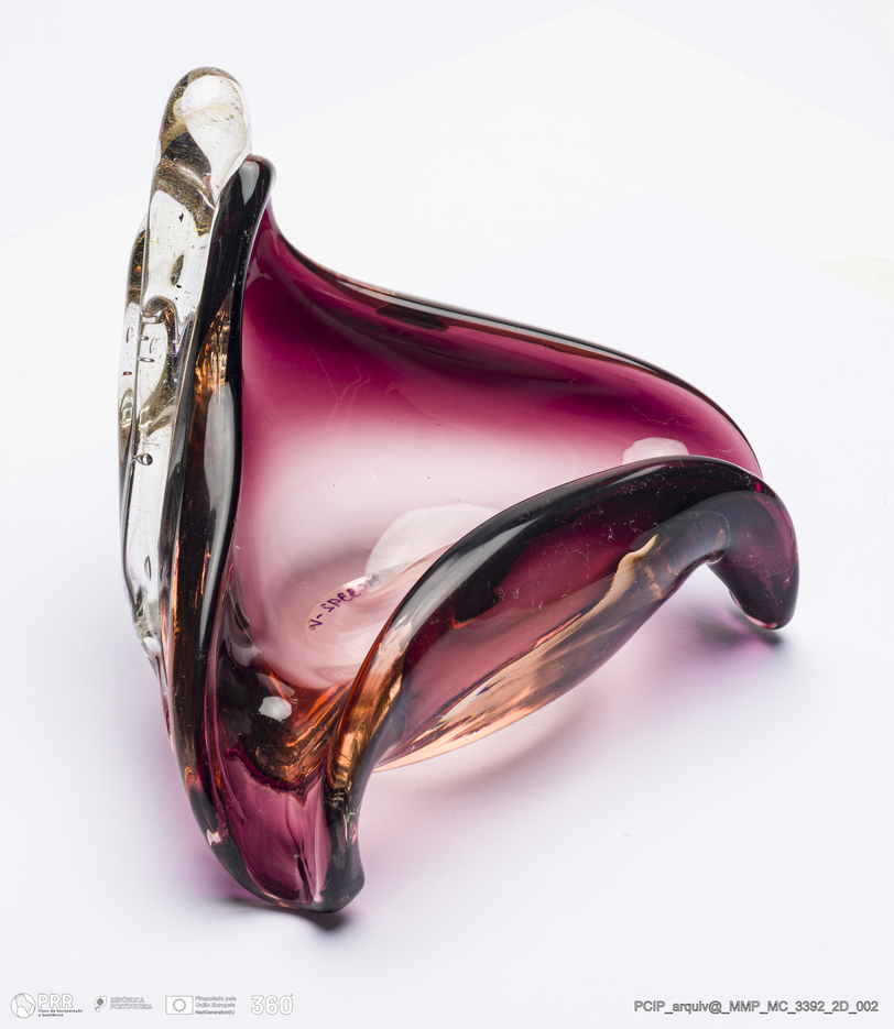 Matéria/Técnica: Vidro roxo com branco e dourado; Cronologia: Século XX; Autoria: Desconhecido / Murano, Itália; Dimensões (cm): Altura: 14,3; Largura: 14,2; Comprimento: 17,3.
