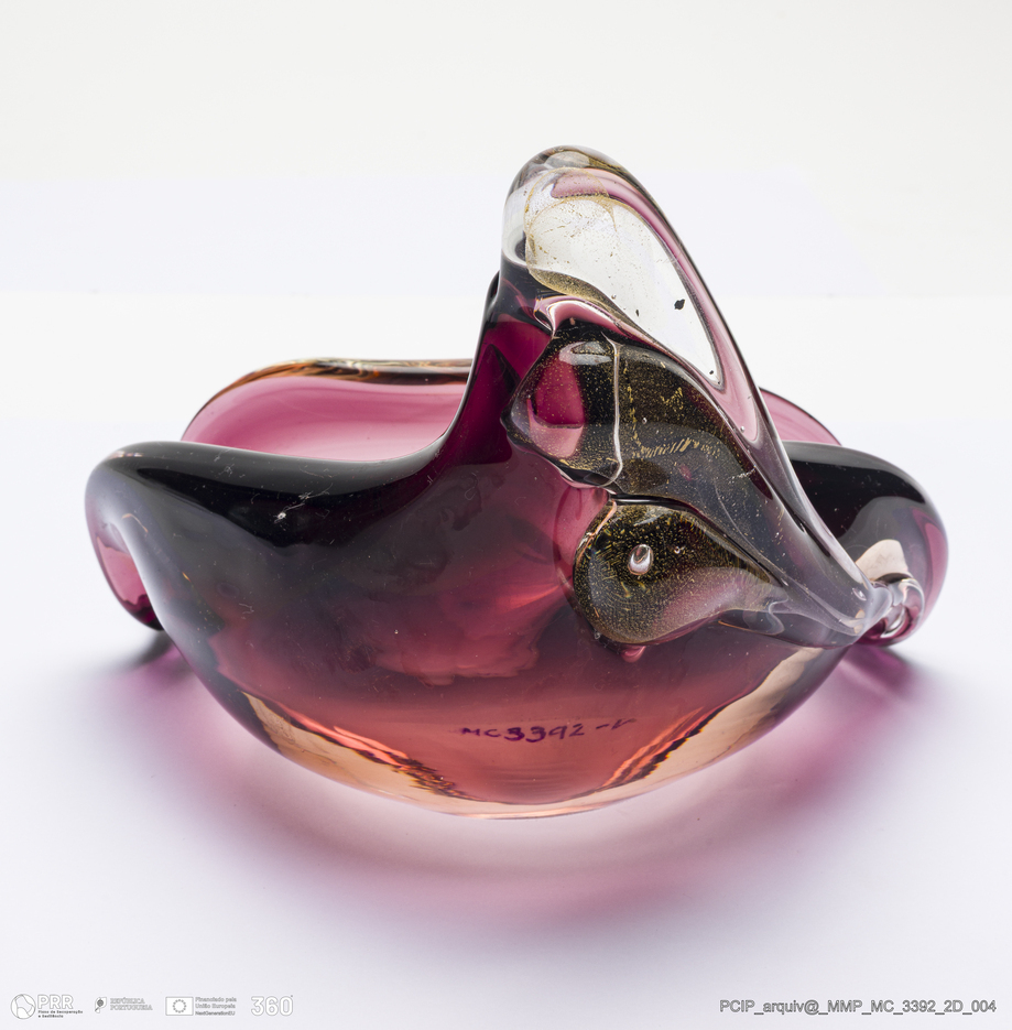 Matéria/Técnica: Vidro roxo com branco e dourado; Cronologia: Século XX; Autoria: Desconhecido / Murano, Itália; Dimensões (cm): Altura: 14,3; Largura: 14,2; Comprimento: 17,3.
