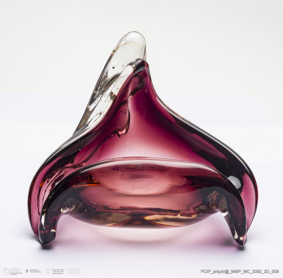 Matéria/Técnica: Vidro roxo com branco e dourado; Cronologia: Século XX; Autoria: Desconhecido / Murano, Itália; Dimensões (cm): Altura: 14,3; Largura: 14,2; Comprimento: 17,3.