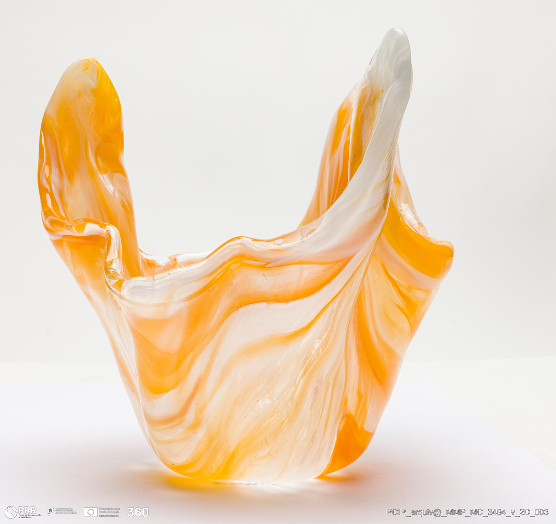 Matéria/Técnica: Vidro transparente com laranja e branco; Cronologia: século XX; Autoria: Desconhecido / Giftcraf / EUA; Dimensões (cm): Altura: 19,5; Largura: 19,5; Comprimento: 20,5.