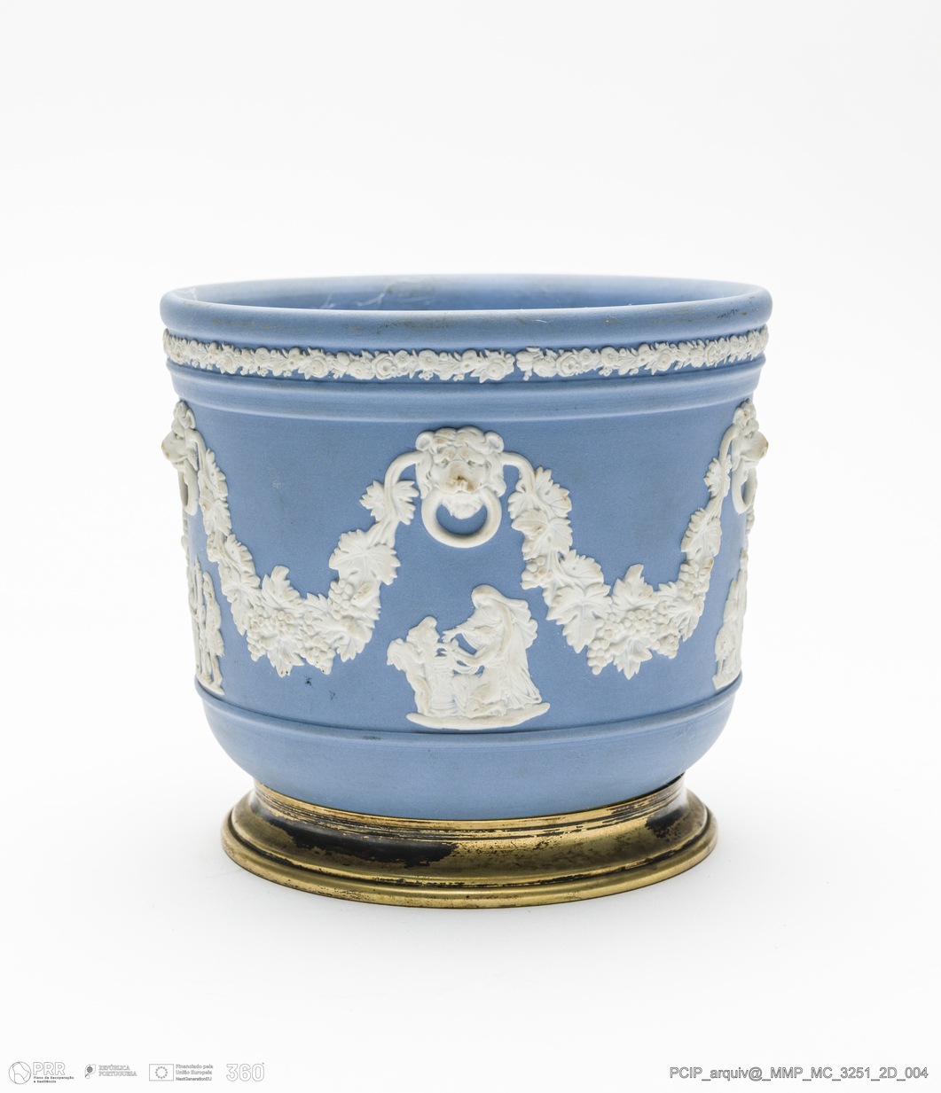 Matéria/Técnica: Porcelana moldada e polícroma azul, dourado e branco; Cronologia: 1956; Autoria: Desconhecido. Wedgwood; Dimensões (cm): Altura: 11,5; Diâmetro: 12,7 .