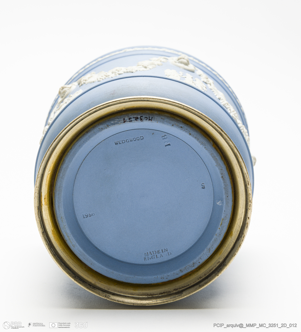 Matéria/Técnica: Porcelana moldada e polícroma azul, dourado e branco; Cronologia: 1956; Autoria: Desconhecido. Wedgwood; Dimensões (cm): Altura: 11,5; Diâmetro: 12,7 .