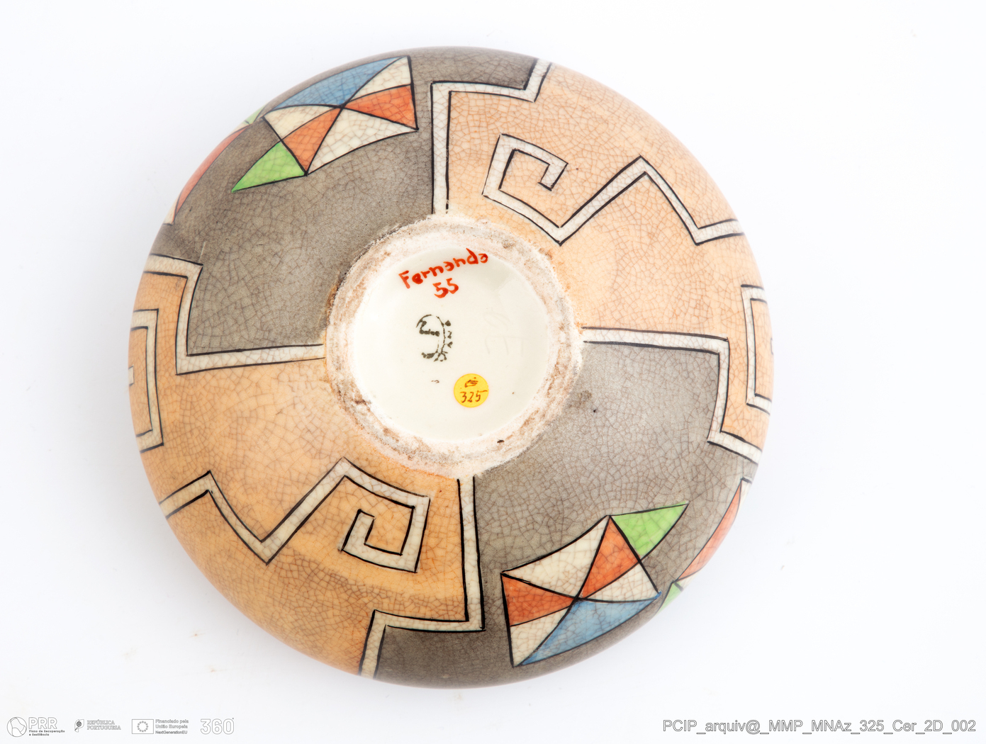 Matéria/Técnica: Faiança; Cronologia: ass.e dat. 55; Autoria: Fernanda Araújo Soares; C.F. Viana; Dimensões: Altura: 6,5 cm x Diam. 14 cm.
