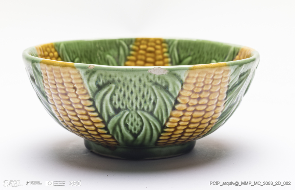 Matéria/Técnica: Barro branco moldado. Vidrado polícromo: verde, amarelo, laranja, castanho claro e camurça; Cronologia: 1962-1990; Autoria: Herdeiros, Belo / Fábrica de Faianças Belo, Caldas da Rainha, Portugal; Dimensões (cm): Altura: 6; Diâmetro:13,4.