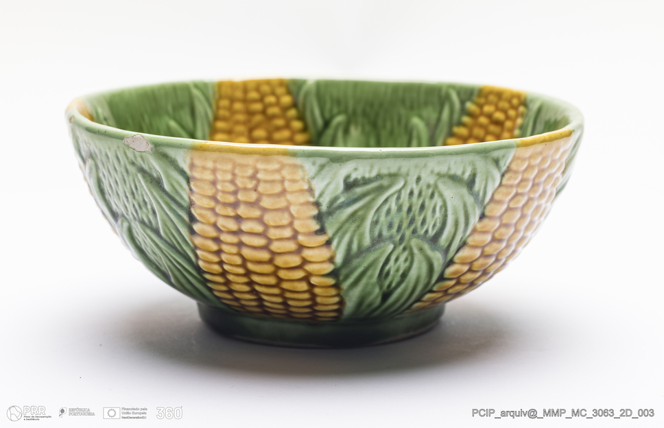 Matéria/Técnica: Barro branco moldado. Vidrado polícromo: verde, amarelo, laranja, castanho claro e camurça; Cronologia: 1962-1990; Autoria: Herdeiros, Belo / Fábrica de Faianças Belo, Caldas da Rainha, Portugal; Dimensões (cm): Altura: 6; Diâmetro:13,4.