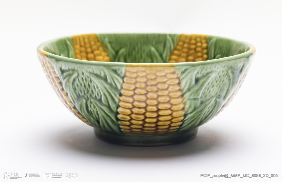 Matéria/Técnica: Barro branco moldado. Vidrado polícromo: verde, amarelo, laranja, castanho claro e camurça; Cronologia: 1962-1990; Autoria: Herdeiros, Belo / Fábrica de Faianças Belo, Caldas da Rainha, Portugal; Dimensões (cm): Altura: 6; Diâmetro:13,4.