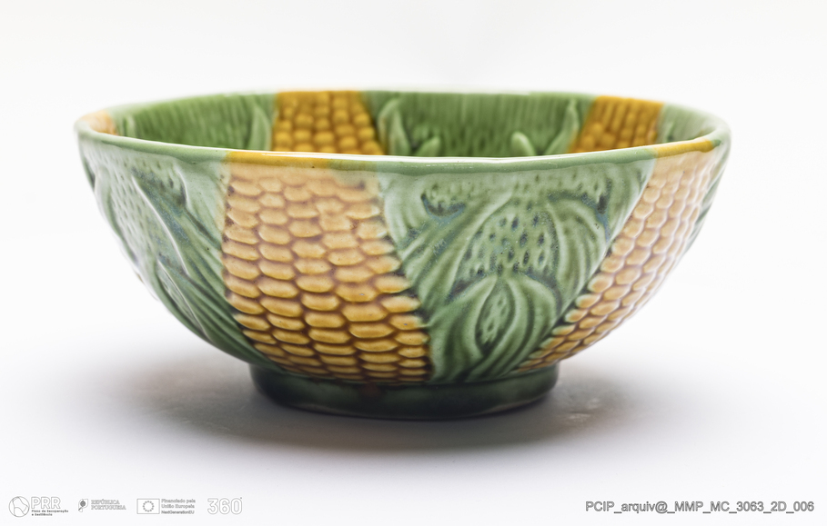 Matéria/Técnica: Barro branco moldado. Vidrado polícromo: verde, amarelo, laranja, castanho claro e camurça; Cronologia: 1962-1990; Autoria: Herdeiros, Belo / Fábrica de Faianças Belo, Caldas da Rainha, Portugal; Dimensões (cm): Altura: 6; Diâmetro:13,4.