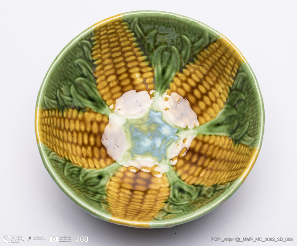 Matéria/Técnica: Barro branco moldado. Vidrado polícromo: verde, amarelo, laranja, castanho claro e camurça; Cronologia: 1962-1990; Autoria: Herdeiros, Belo / Fábrica de Faianças Belo, Caldas da Rainha, Portugal; Dimensões (cm): Altura: 6; Diâmetro:13,4.