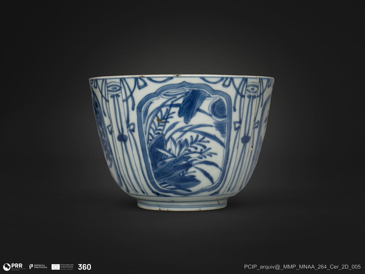 Matéria/Técnica: Moldada e pintada a azul cobalto sob o vidrado; Cronologia: 1595-1615; Autoria: Desconhecida; Dimensões (cm): Altura: 9,4 x Diâmetro: 13,5.