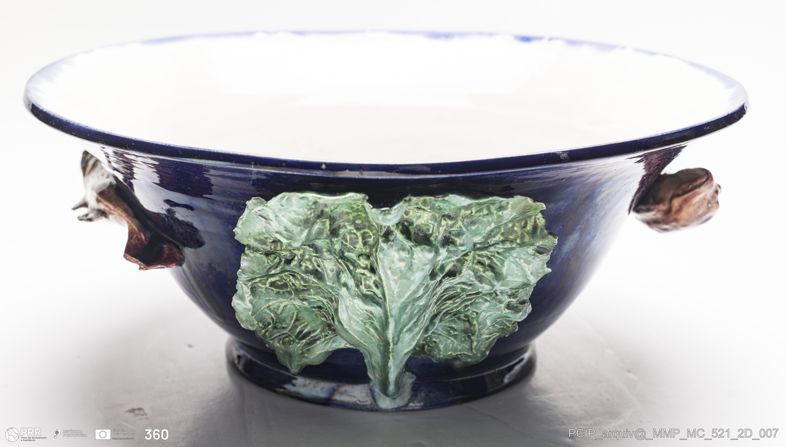 Matéria/Técnica: Barro rodado e moldado. Vidrado polícromo: verde, vermelho, azul e branco,; Cronologia: 1892-1896; Autoria: Desconhecido / Atribuído ao Atelier Cerâmico, Caldas da Rainha, Portugal; Dimensões (cm): Altura: 15,5; Diâmetro:37,2.