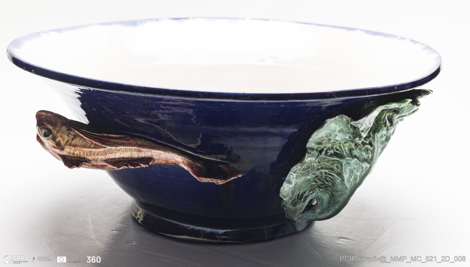 Matéria/Técnica: Barro rodado e moldado. Vidrado polícromo: verde, vermelho, azul e branco,; Cronologia: 1892-1896; Autoria: Desconhecido / Atribuído ao Atelier Cerâmico, Caldas da Rainha, Portugal; Dimensões (cm): Altura: 15,5; Diâmetro:37,2.