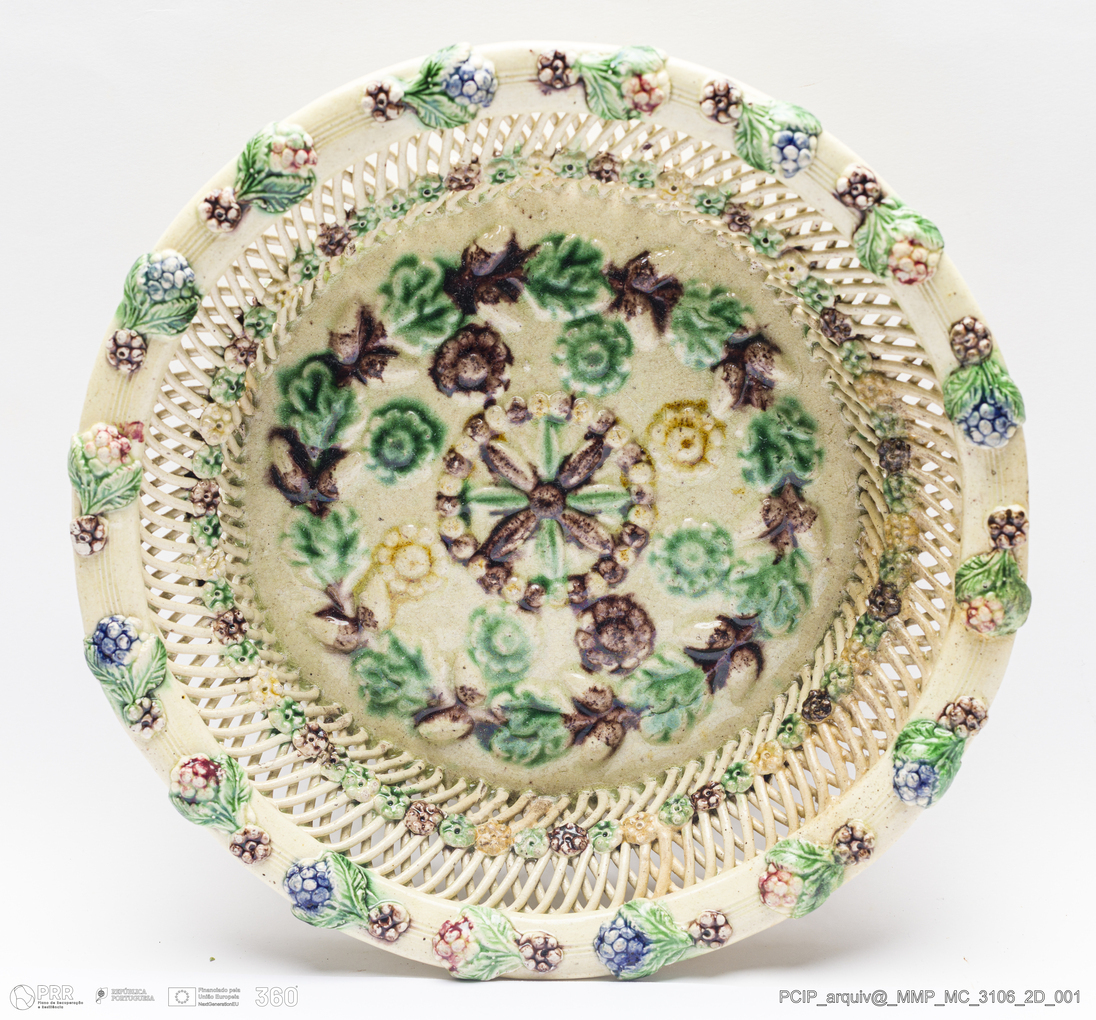 Matéria/Técnica: Barro branco. Técnica da verguinha, que consiste no entrelaçar, sobre uma forma escolhiada, tiras de pasta obtidas através de uma máquina adaptada para o efeito, dita o engenho. Vidrado polícromo: castanho, verde, vermelho, azul, amarelo e camurça; Cronologia: 1860; Autoria: Manel Cipriano Gomes Mafra / Fábrica de Manuel Cipriano Gomes O Mafra, Caldas da Rainha, Portugal; Dimensões (cm): Altura: 5,5; Diâmetro:23.