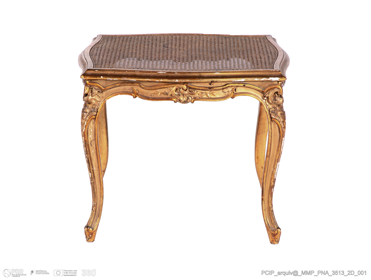 Matéria/Técnica: Madeira de (?); palhinha; folha de ouro; Cronologia: Século XIX; Autoria: Desconhecida; Dimensões (cm): Altura: 40,0; Largura: 50,0; Profundidade: 45,5.