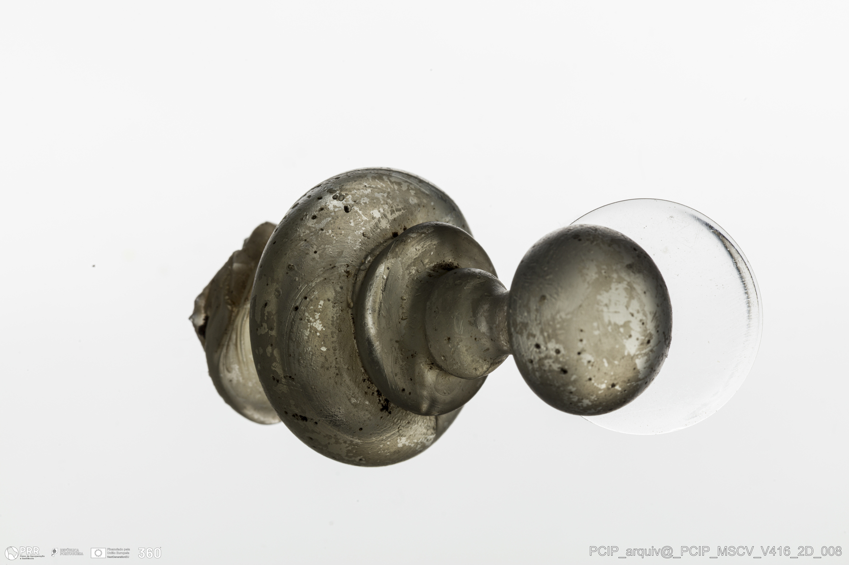 Matéria/Técnica: Vidro; Cronologia: Século XVII; Autoria: Desconhecida; Dimensões: Largura: 25mm; Altura: 48mm.