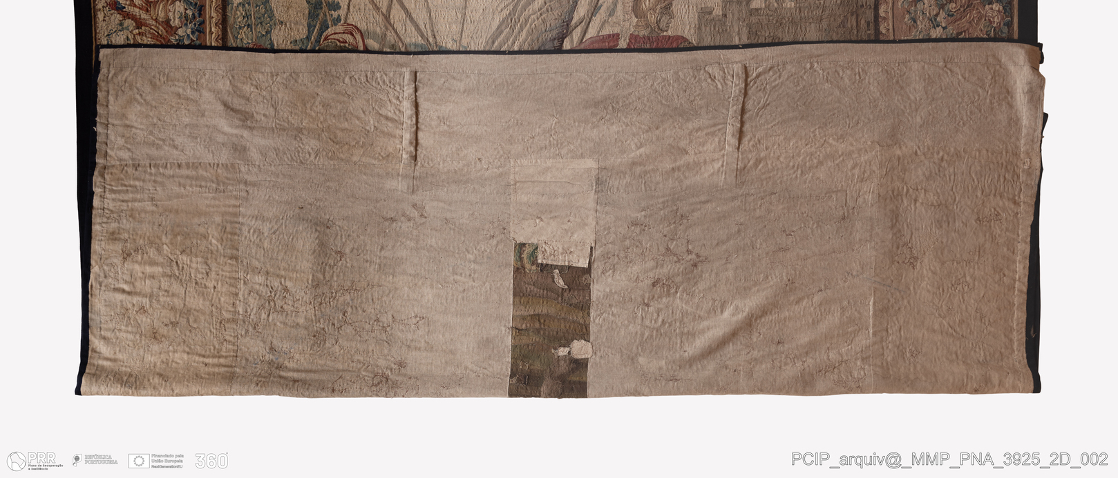 Matéria/Técnica: Tapeçaria de liço; Cronologia: Século XVIII; Autoria: Desconhecida; Dimensões: Altura: 447,5 cm x Largura: 374 cm.