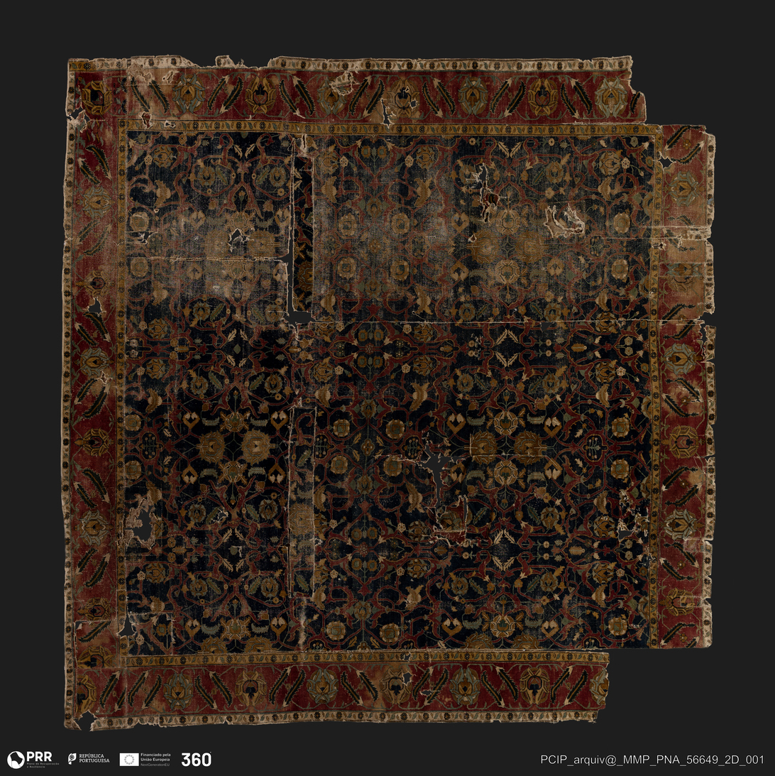 Matéria/Técnica: Tapete de nó; Cronologia: Desconhecida; Autoria: Desconhecida; Dimensões: Desconhecidas.