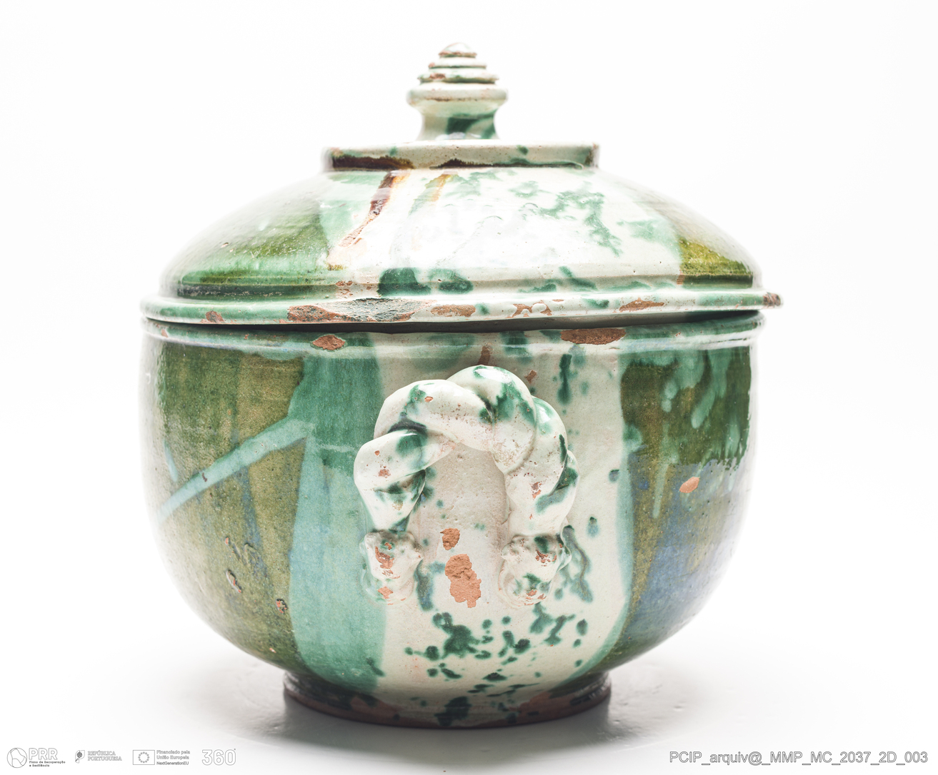 Matéria/Técnica: Barro vermelho rodado e modelado. Vidrado verde e branco; Cronologia: século XVIII-XIX; Autoria: Desconhecido / Caldas da Rainha, Portugal; Dimensões (cm): Altura: 26; Diâmetro:29,5.