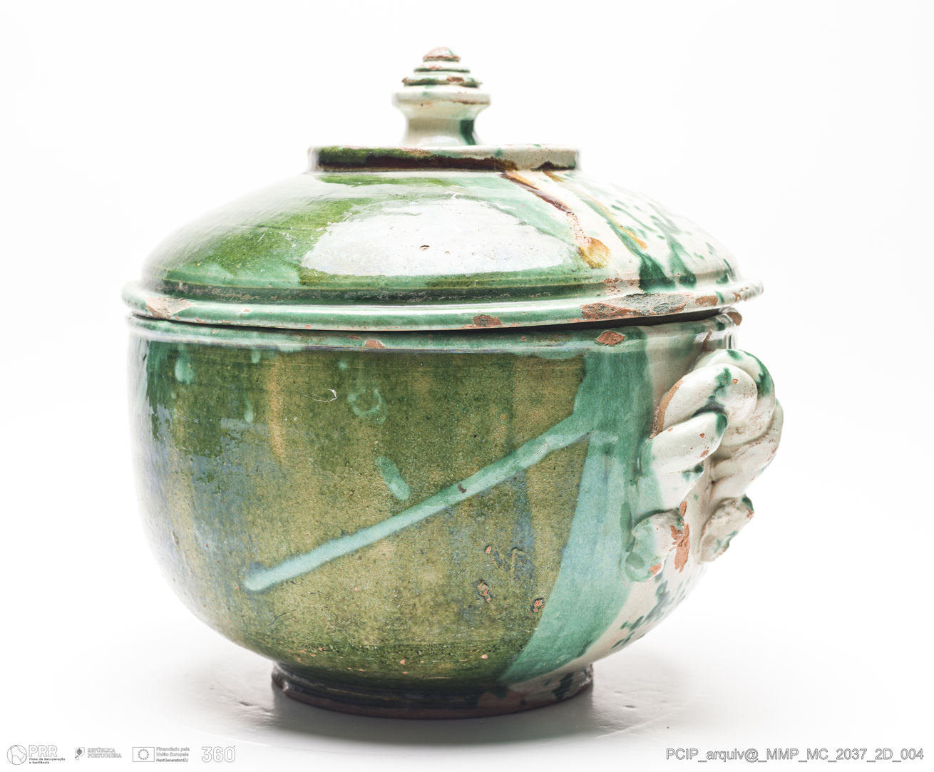 Matéria/Técnica: Barro vermelho rodado e modelado. Vidrado verde e branco; Cronologia: século XVIII-XIX; Autoria: Desconhecido / Caldas da Rainha, Portugal; Dimensões (cm): Altura: 26; Diâmetro:29,5.
