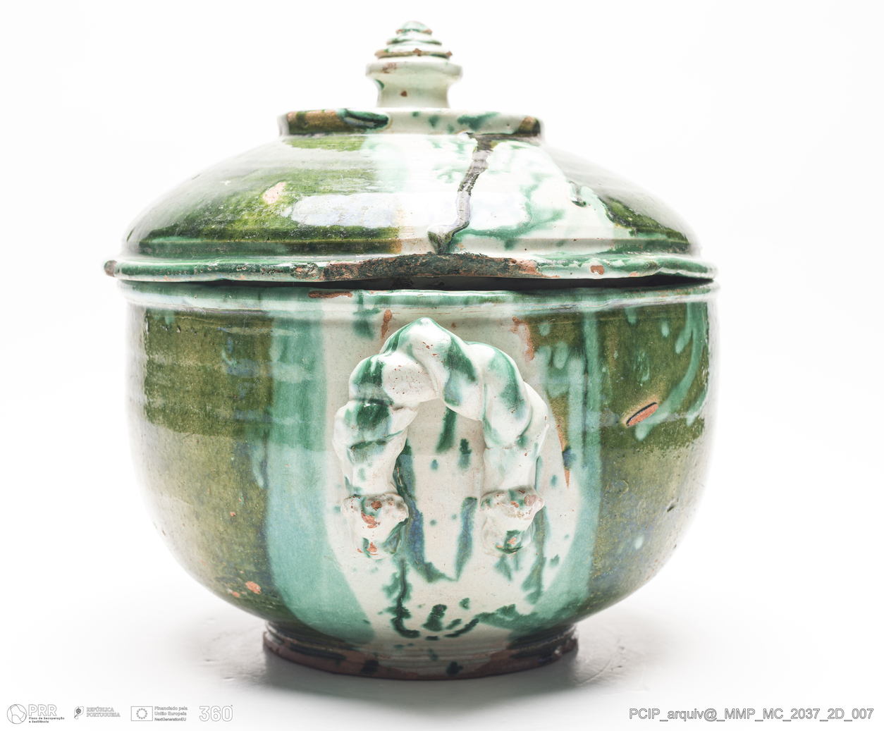 Matéria/Técnica: Barro vermelho rodado e modelado. Vidrado verde e branco; Cronologia: século XVIII-XIX; Autoria: Desconhecido / Caldas da Rainha, Portugal; Dimensões (cm): Altura: 26; Diâmetro:29,5.
