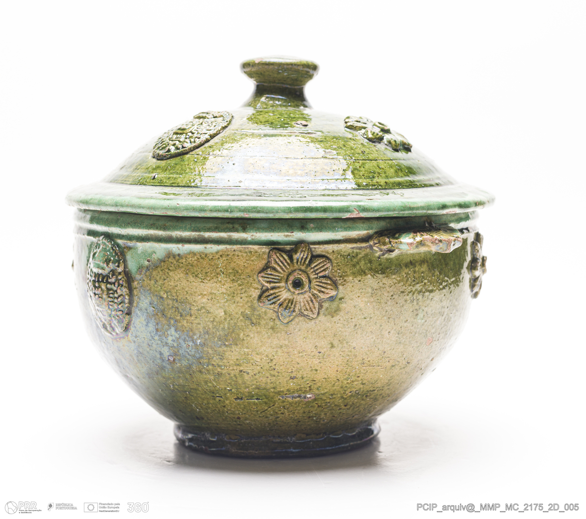 Matéria/Técnica: Barro rodado. Vidrado em tons de verde; Cronologia: século XVIII-XIX; Autoria: Desconhecido; Dimensões (cm): Altura: 19; Diâmetro:18,5.