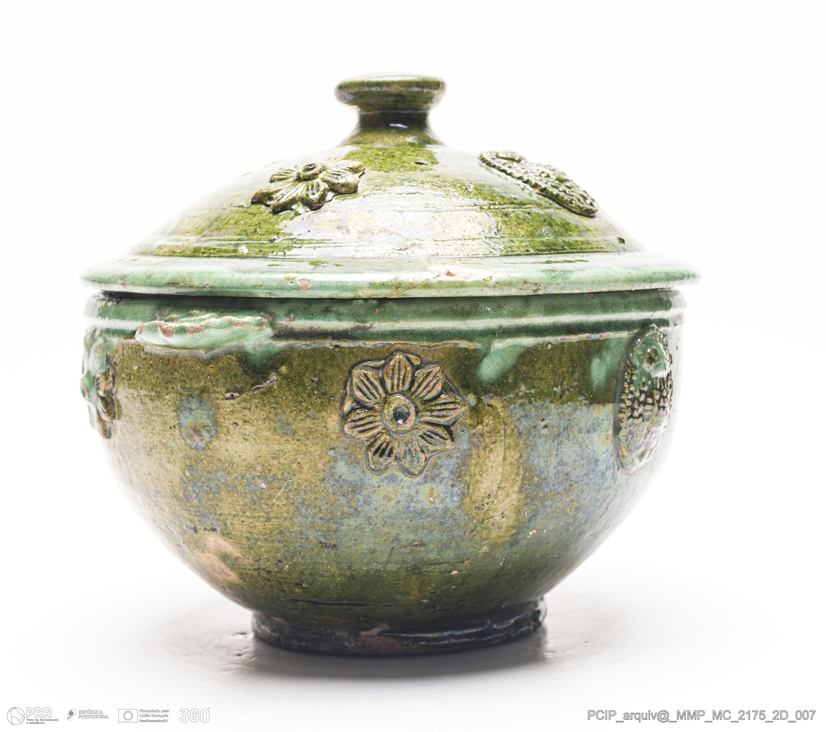 Matéria/Técnica: Barro rodado. Vidrado em tons de verde; Cronologia: século XVIII-XIX; Autoria: Desconhecido; Dimensões (cm): Altura: 19; Diâmetro:18,5.