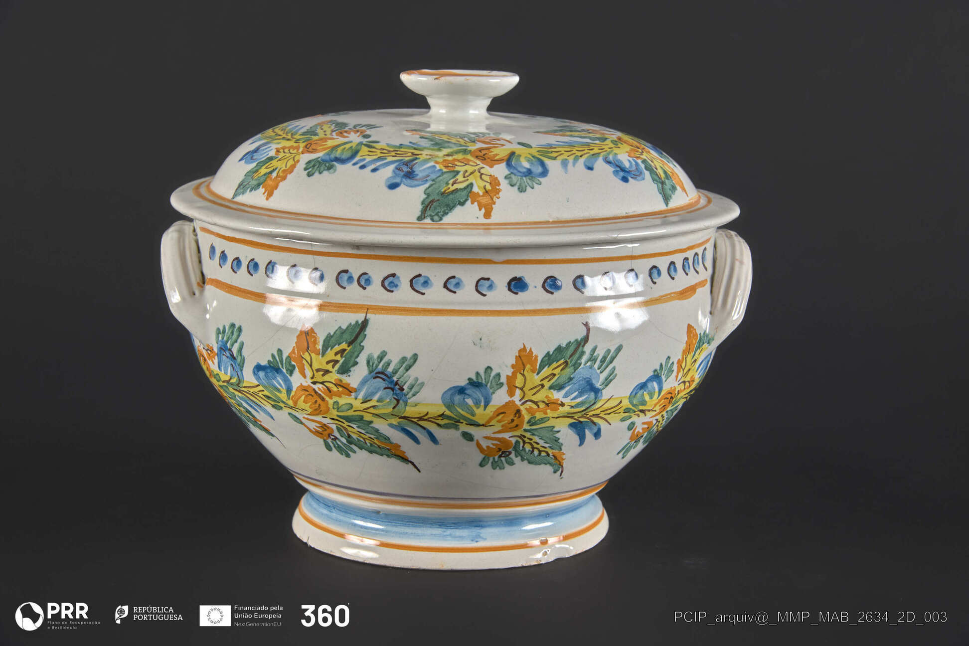 Matéria/Técnica: Faiança rodada, vidrada, com decoração pintada a cor de laranja, amarelo, azul e castanho; Cronologia: Desconhecida; Autoria: Desconhecida; Dimensões: Desconhecidas.