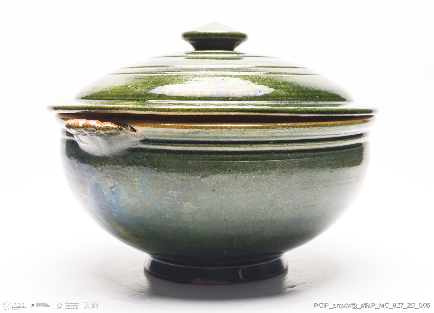 Matéria/Técnica: Barro vermelho rodado. Vidrado verde de cobre no exterior e amarelo ferro no interior; Cronologia: 1977; Autoria: João Jesuíno Marques dos Reis / Olaria de João Reis, Caldas da Rainha, Portugal; Dimensões (cm): Altura: 22,5; Largura: 32,5.