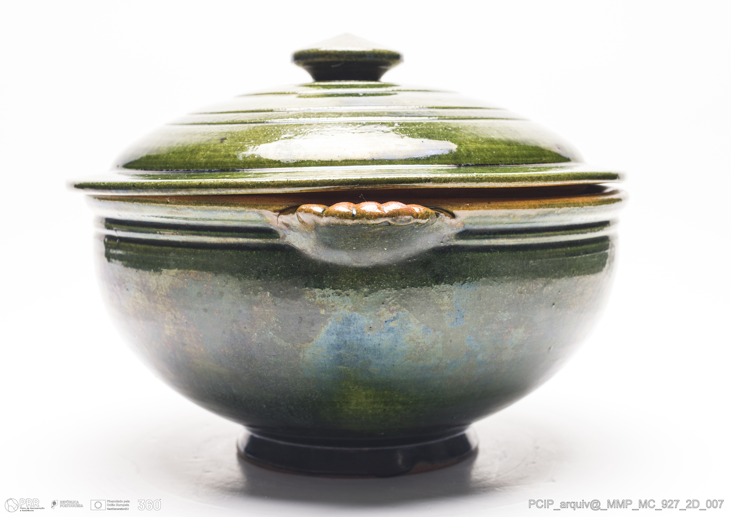Matéria/Técnica: Barro vermelho rodado. Vidrado verde de cobre no exterior e amarelo ferro no interior; Cronologia: 1977; Autoria: João Jesuíno Marques dos Reis / Olaria de João Reis, Caldas da Rainha, Portugal; Dimensões (cm): Altura: 22,5; Largura: 32,5.