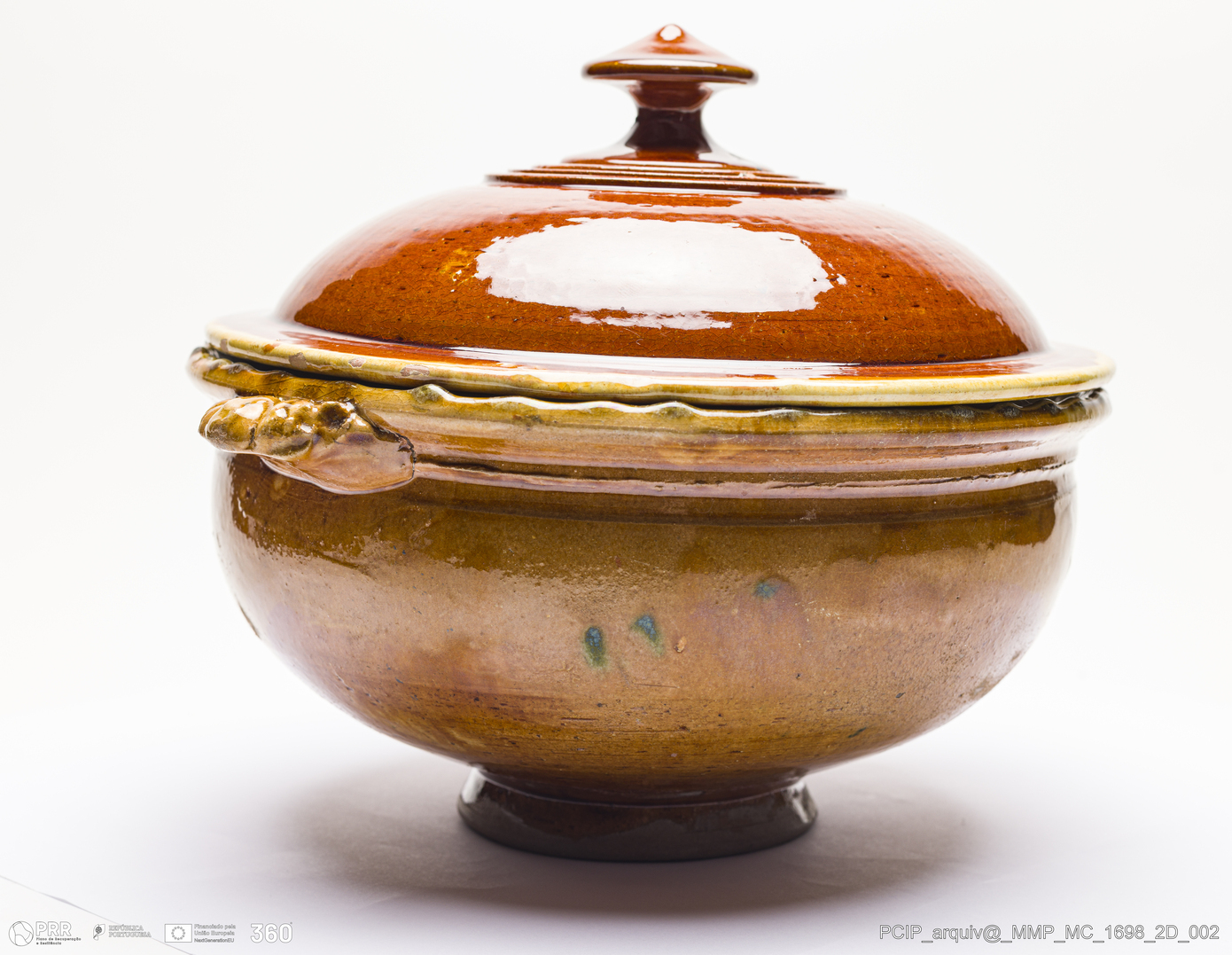 Matéria/Técnica: Barro vermelho rodado e moldado. Vidrado castanho mel; Cronologia: século XX; Autoria: Desconhecido / Olaria de António de Oliveira, Caldas da Rainha, Portugal; Dimensões (cm): Altura: 22; Diâmetro:29.