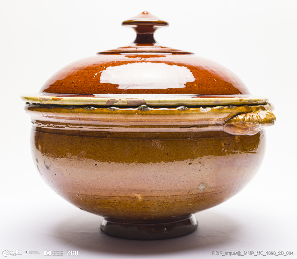 Matéria/Técnica: Barro vermelho rodado e moldado. Vidrado castanho mel; Cronologia: século XX; Autoria: Desconhecido / Olaria de António de Oliveira, Caldas da Rainha, Portugal; Dimensões (cm): Altura: 22; Diâmetro:29.