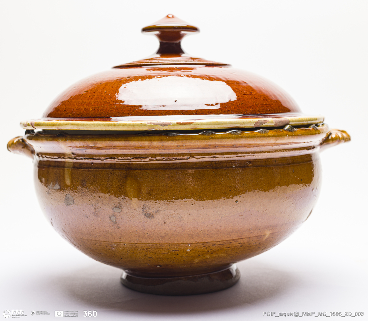 Matéria/Técnica: Barro vermelho rodado e moldado. Vidrado castanho mel; Cronologia: século XX; Autoria: Desconhecido / Olaria de António de Oliveira, Caldas da Rainha, Portugal; Dimensões (cm): Altura: 22; Diâmetro:29.
