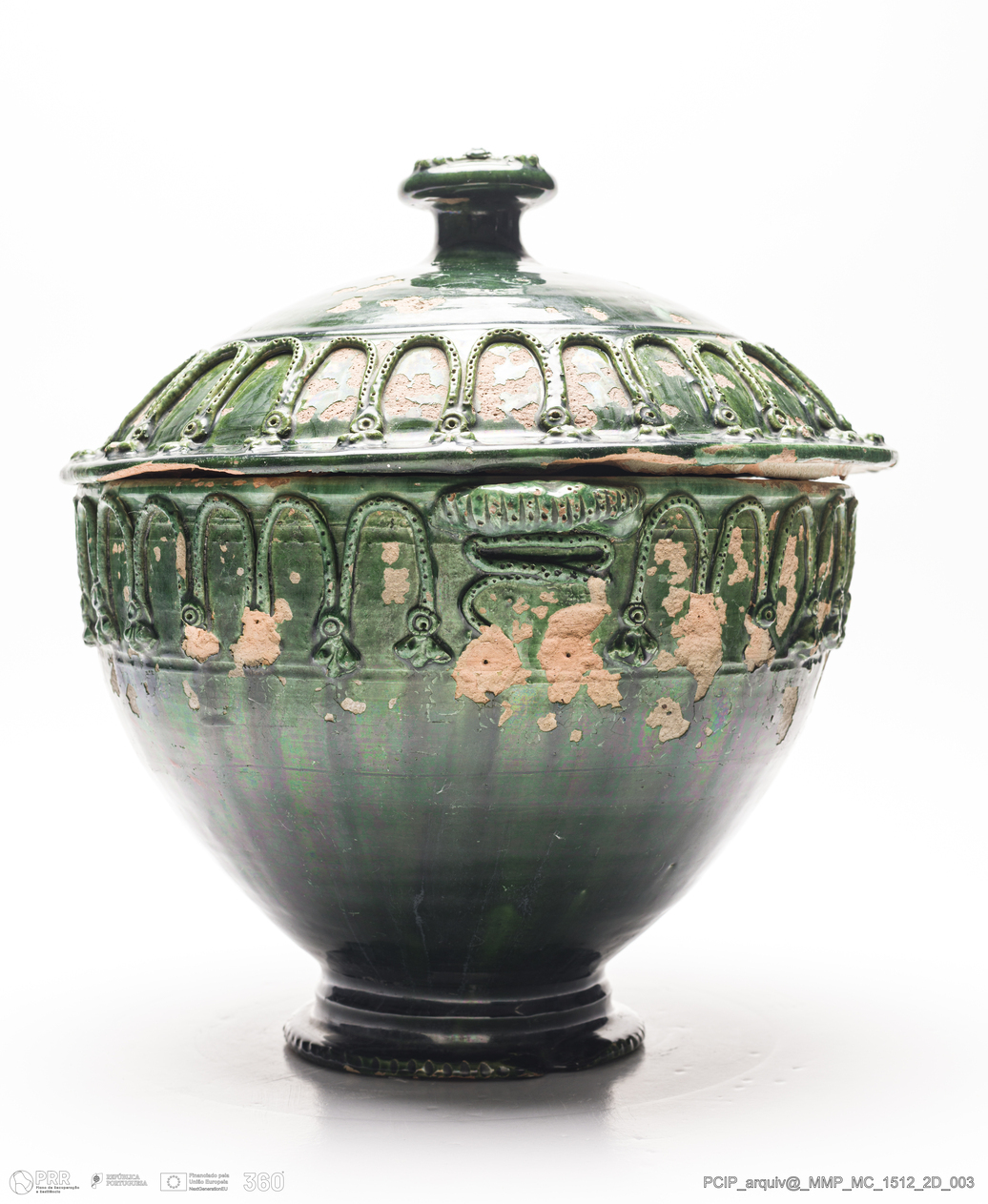 Matéria/Técnica: Barro vermelho rodado e modelado. Vidrado verde de cobre e chumbo; Cronologia: século XVII-XVIII; Autoria: Desconhecido / Caldas da Rainha; Dimensões (cm): Altura: 33; Diâmetro: 32,5.