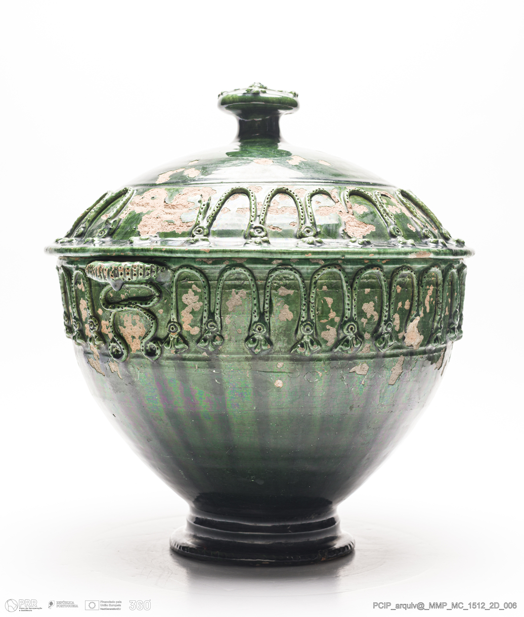 Matéria/Técnica: Barro vermelho rodado e modelado. Vidrado verde de cobre e chumbo; Cronologia: século XVII-XVIII; Autoria: Desconhecido / Caldas da Rainha; Dimensões (cm): Altura: 33; Diâmetro: 32,5.
