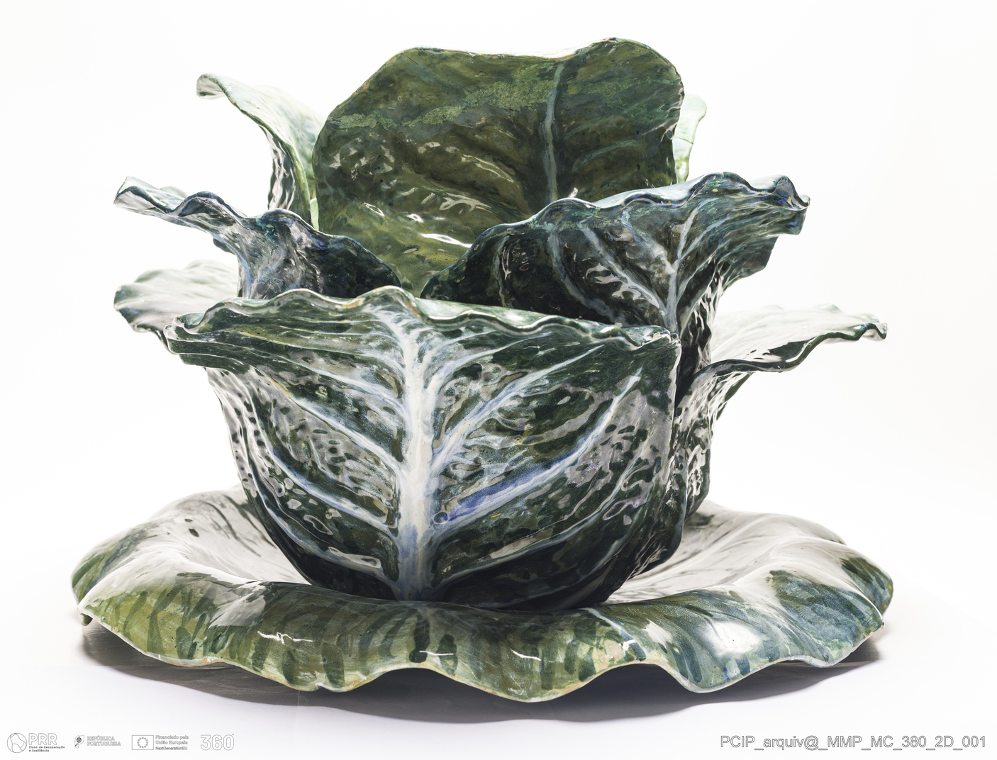 Matéria/Técnica: Barro branco moldado e modelado. Vidrado polícromo: verde e azul; Cronologia: Século XIX; Autoria: Wenceslau Cifka / Fábrica Constância, Lisboa, Portugal; Dimensões (cm): Altura: 50; Largura: 47; Comprimento: 30.