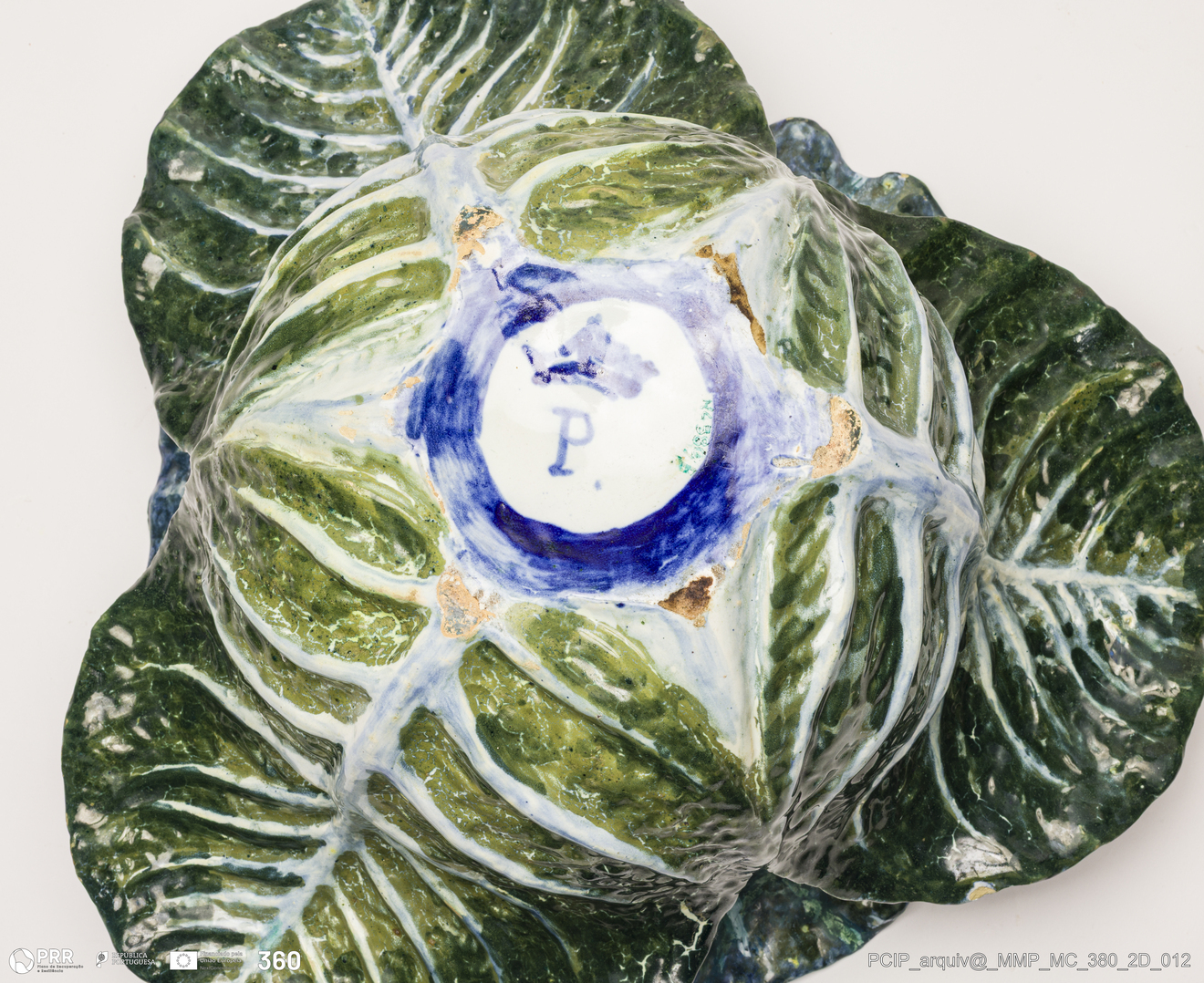 Matéria/Técnica: Barro branco moldado e modelado. Vidrado polícromo: verde e azul; Cronologia: Século XIX; Autoria: Wenceslau Cifka / Fábrica Constância, Lisboa, Portugal; Dimensões (cm): Altura: 50; Largura: 47; Comprimento: 30.