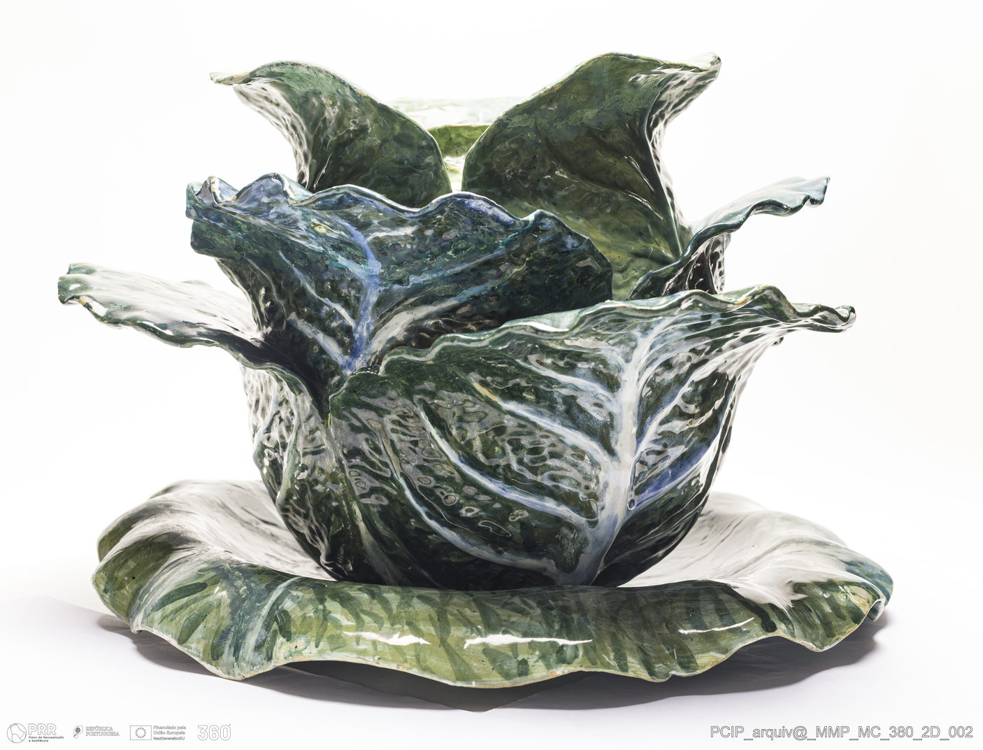 Matéria/Técnica: Barro branco moldado e modelado. Vidrado polícromo: verde e azul; Cronologia: Século XIX; Autoria: Wenceslau Cifka / Fábrica Constância, Lisboa, Portugal; Dimensões (cm): Altura: 50; Largura: 47; Comprimento: 30.