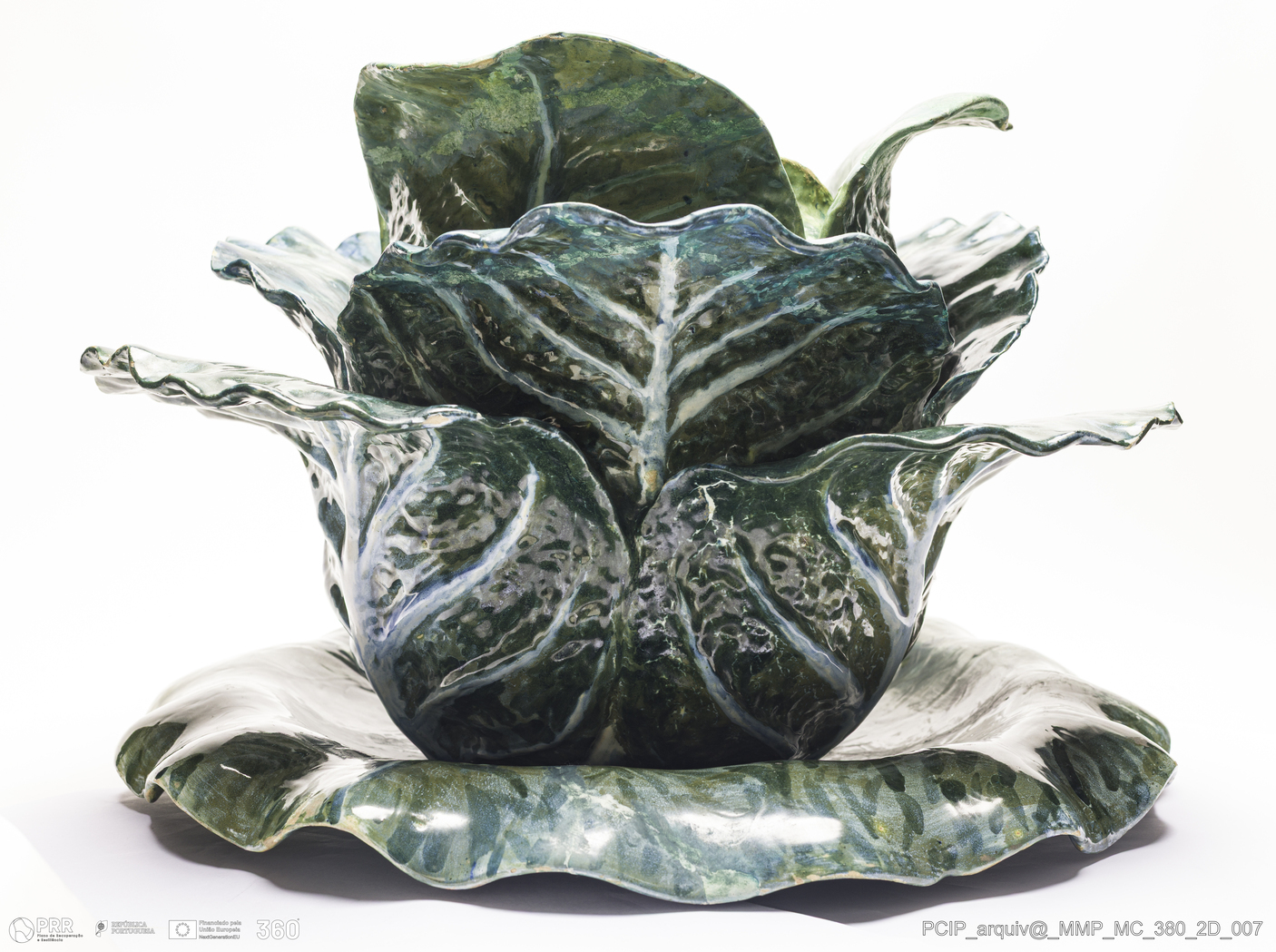 Matéria/Técnica: Barro branco moldado e modelado. Vidrado polícromo: verde e azul; Cronologia: Século XIX; Autoria: Wenceslau Cifka / Fábrica Constância, Lisboa, Portugal; Dimensões (cm): Altura: 50; Largura: 47; Comprimento: 30.