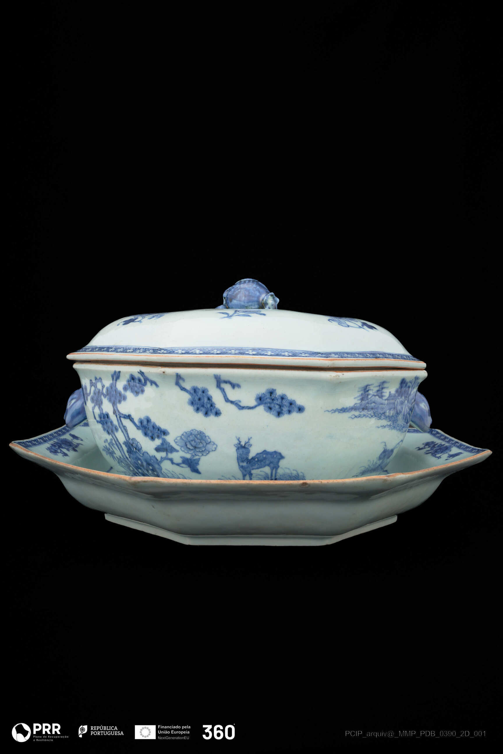 Matéria/Técnica: Desconhecida; Cronologia: Século XVIII; Autoria: Desconhecida; Dimensões (cm): Altura: Ter.: 19,2 Prato: 6,2; Largura: Ter.: 33,7; Diâmetro: Ter.: 28,4 Prato: 37,5.