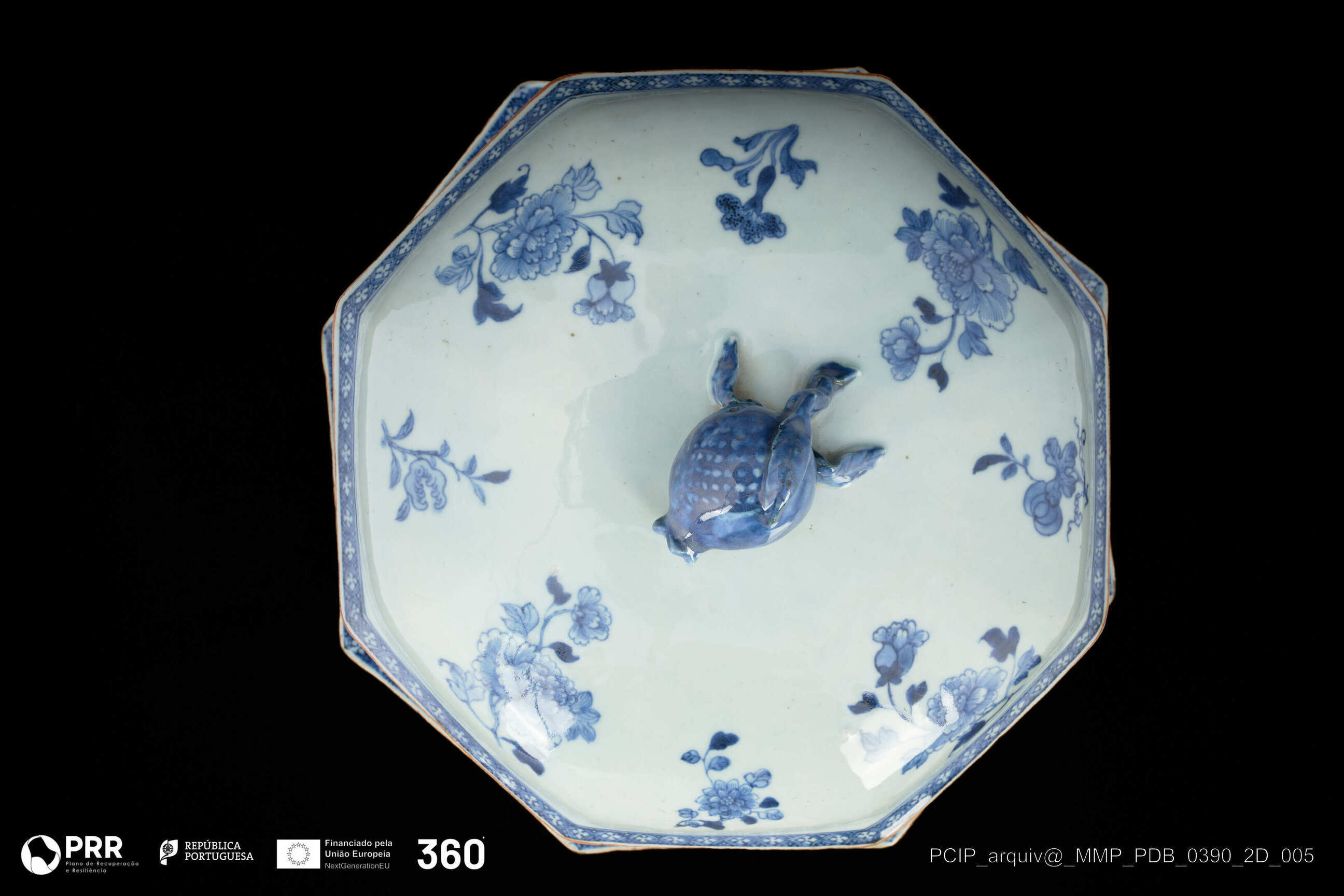 Matéria/Técnica: Desconhecida; Cronologia: Século XVIII; Autoria: Desconhecida; Dimensões (cm): Altura: Ter.: 19,2 Prato: 6,2; Largura: Ter.: 33,7; Diâmetro: Ter.: 28,4 Prato: 37,5.